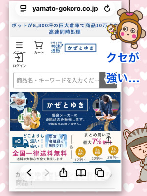 などのコンセプトと、社名(大和心=やまとごころ)や「神速通販」のウリが、宗教っぽくて。