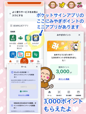 【物価高騰対策】3,000円付与おはヨッシー٩( 'ω' )و物価が上がって、スーパーもコンビニも「え、こんな高かったっけ?」ってなりがちな今日この頃…。そんな市民の味方…!「せんだい生活応援!!ポイントキャンペーン」が始まりました٩( 'ω' )و今回は、物価高騰に直面する市民のみなさまに、できるだけ早くポイントをお届けするぞ! ということで、すでにある 「みやぎポイント」 の仕組みを使って、サクッと実施することになったそうです。というワケで。条件を満たして登録すると、県内の登録店舗で使える3,000円相当の「みやぎポイント」が受け取れまふ☆◼️ ポイント発行期間:1月21日〜6月30日まで◼️ ポイント利用期限:12月31日まで(今年いっぱい)つまり…もらうのは 6月末まで使うのは 年末まで、です。やることは簡単!(ざっくり言うと)◼️ デジタル身分証アプリ「ポケットサイン」 をダウンロードして◼️ マイナンバーカードで登録するだけこれで、ポイントが受け取れまふ☆さらに、まだアプリを利用していない方は、2月末まで二重取りチャンス☆2月末まで、宮城県の「アプリ新規登録キャンペーン」もやっているので、◼️県のポイント +◼️仙台市の応援ポイント合わせて受け取れまふ=二重取りというわけで\\今やるのが一番お得です//ただ…利用登録するには、スマホ+マイナンバーカードが必要なのです(>_